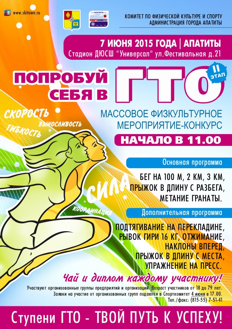 05 июня 2015 7 июня на стадионе МБОУ ДОД ДЮСШ «Универсал» (ул. Фестивальная, 21) состоится второй этап массового физкультурного мероприятия – конкурса «Попробуй себя в ГТО!». Участникам представится возможность проявить себя в различных испытаниях физкультурно-спортивного комплекса. Основная программа мероприятия включает в себя три теста: бег (на 100 м, 2 и 3 км), прыжок в длину с разбега и метание гранаты. Для тех же участников, кто не смог принять участие в 1-ом этапе конкурса, будет предложена дополнительная программа - все тесты 1-го этапа на универсальной площадке стадиона: подтягивание на перекладине (высокой и низкой), рывок гири 16 кг, отжимание, наклоны вперед, прыжок в длину с места и упражнение на пресс. А начнется мероприятие с разминки, которую проведет серебряная призерка летних Олимпийских игр в Афинах (2004 г.), бронзовая призерка Чемпионата мира и Чемпионата Европы по легкой атлетике (2002 и 2003 гг.), заслуженный мастер спорта, Лариса Круглова. Участники получат большой заряд бодрости, который поможет пройти все тесты 2-го этапа конкурса. Начало мероприятия в 11 часов. Заявки на участие в мероприятии оформляются организованными группами – от предприятий и организаций по установленной форме, количественный состав группы от одной организации – не более 20 человек. Возраст участников от 18 до 79 лет. Заявки подаются в Комитет по ФКиС (Дворец спорта ФСК «Атлет», ул. Победы, 4) на совещание представителей команд и ГСК, которое состоится 4 июня 2015 г. (четверг) в 17.00. Присутствие представителей команд на совещании обязательно! Более подробно ознакомиться с Положением о массовом физкультурном мероприятии - конкурсе «Попробуй себя в ГТО!» можно на сайте Спорткомитета г. Апатиты www.skitown.ru, в разделе «Документы/Положения».